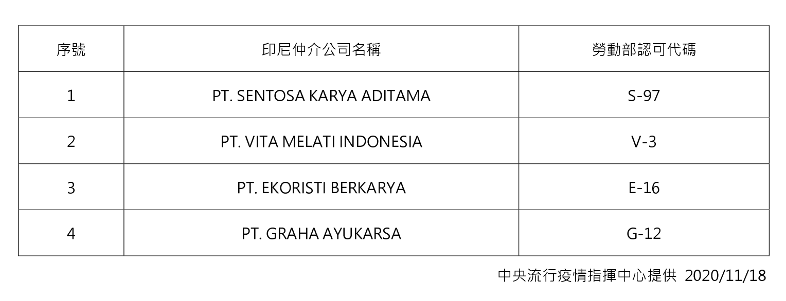 自今(109)年11月20日起,印尼籍移工入境後應接受集中檢疫,並暫緩 PT. SENTOSA KARYA ADITAMA, PT. VITA MELATI INDONESIA, PT. EKORISTI BERKARYA, 以及PT. GRAHA AYUKARSA共4家印尼外國人力仲介公司仲介移工來臺工作,但移工已取得駐外館處核發入國簽證者,不在此限。