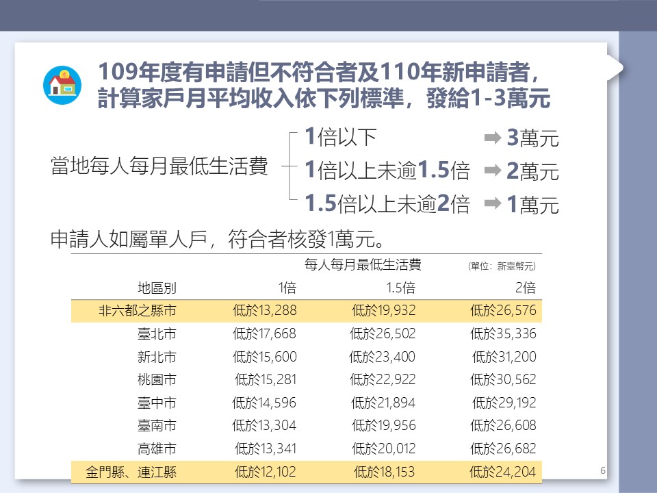 - 家戶平均每人每月生活費為當地每人每月生活費1倍以下者,核發3萬元。