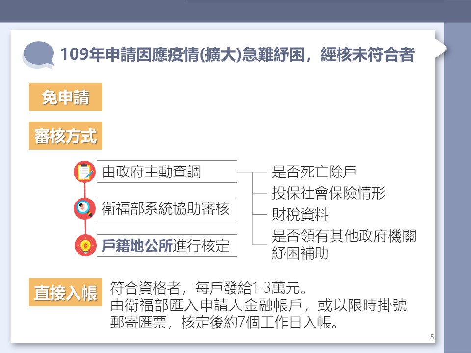 - 109年申請因應疫情(擴大)急難紓困,經核未符合者,免申請,由政府主動查調戶籍、投保資料及是否領有其他政府機關紓困補助。經戶籍地公所核定,符合資格者,每戶發給1至3萬元,由衛福部撥付並寄送核定通知,核定後約7個工作日入帳。