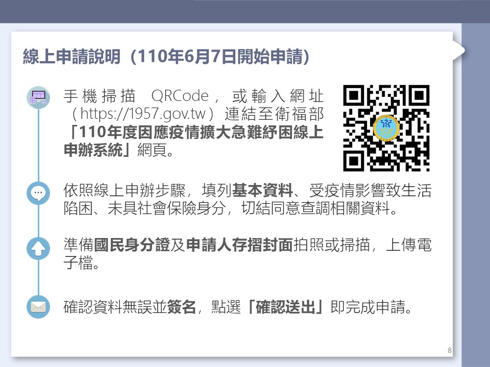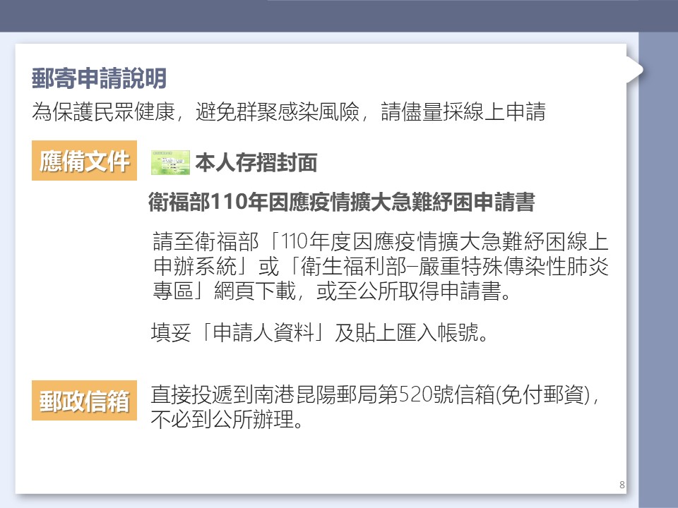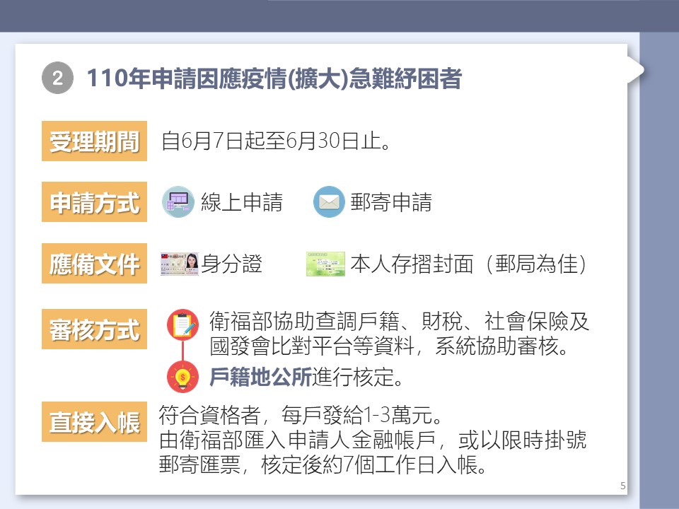- 110年申請因應疫情擴大急難紓困者,採線上或郵寄申請。