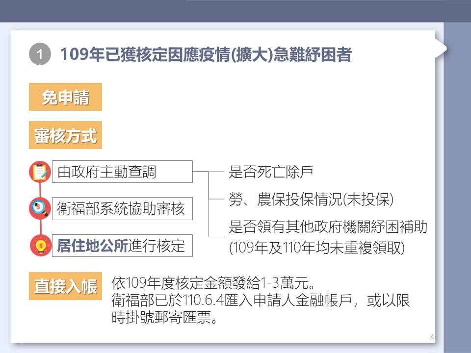 - 109年已獲核定因應疫情(擴大)急難紓困者,免申請,由政府主動查調戶籍、投保資料及是否領有其他政府機關紓困補助(109年重覆申領者今年不予發給)。經居住地公所核定,依109年度核定金額發給。衛福部將於110年6月4日匯入申請人金融帳戶,或以限時掛號郵寄匯票後,寄送核定通知。