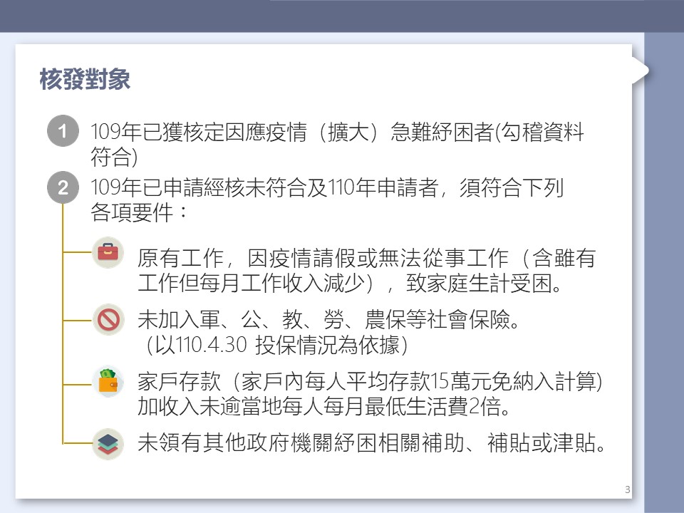 - 109年已獲核定因應疫情(擴大)急難紓困者(勾稽資料符合)。