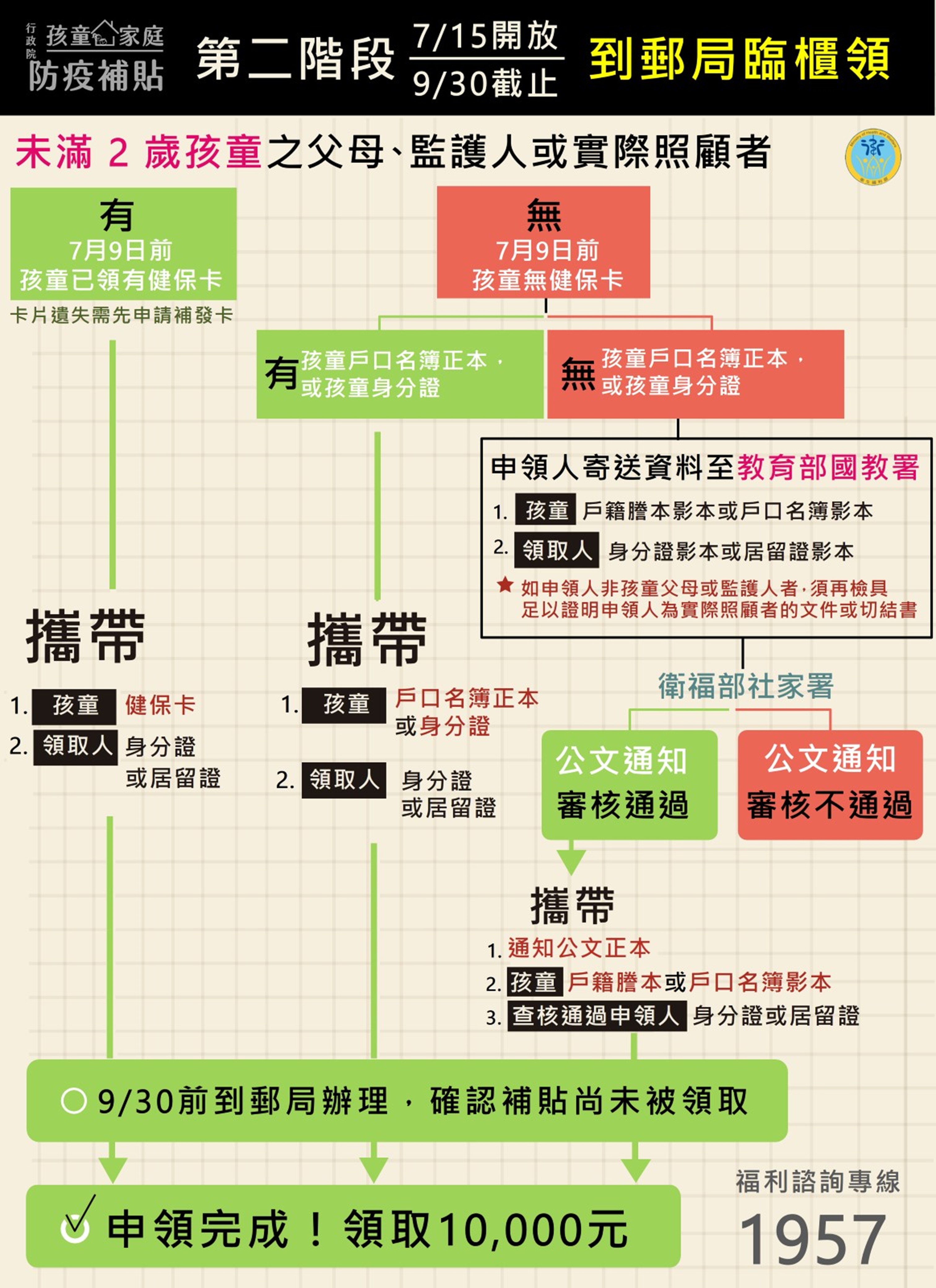 2.教育部國民及學前教育署收件後,將未滿2歲(108年6月1日以後至COVID-19第三級疫情警戒全面解除前出生者)之孩童資料轉由衛福部社會及家庭署查核;查核通過後,再請民眾攜帶衛福部社會及家庭署的公文、申領人身分證正本或居留證正本,以及孩童之戶籍謄本或戶口名簿影本,洽郵局臨櫃辦理。